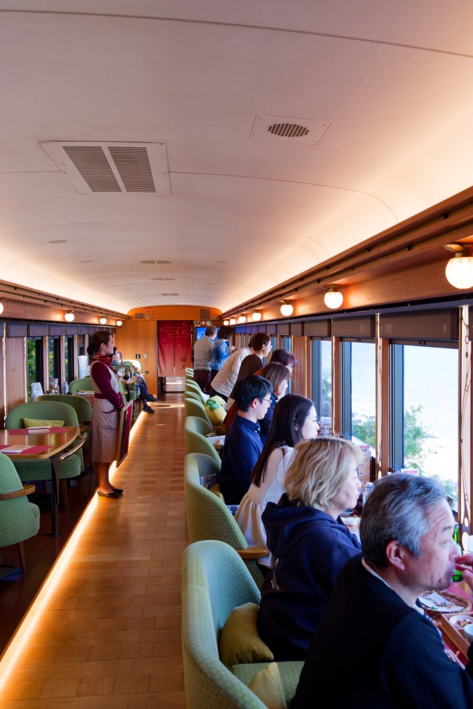 Das Prozedere ist ähnlich wie gestern, aber es ist ein anderes Team; die Zugbegleiterinnen haben andere Uniformen (eigentlich ein völlig unpassender Begriff für die elegante Bekleidung). Die Ausstattung ist ähnlich luxuriös wie gestern, der Stil der Wagen ist jedoch ein anderer – eher retro-modern. Auf der Hinfahrt gibt es ein wunderbares Frühstück in einer Bentobox, dazu eine Suppe und Kaffee. Auch dieser Zug hält unterwegs mehrfach.