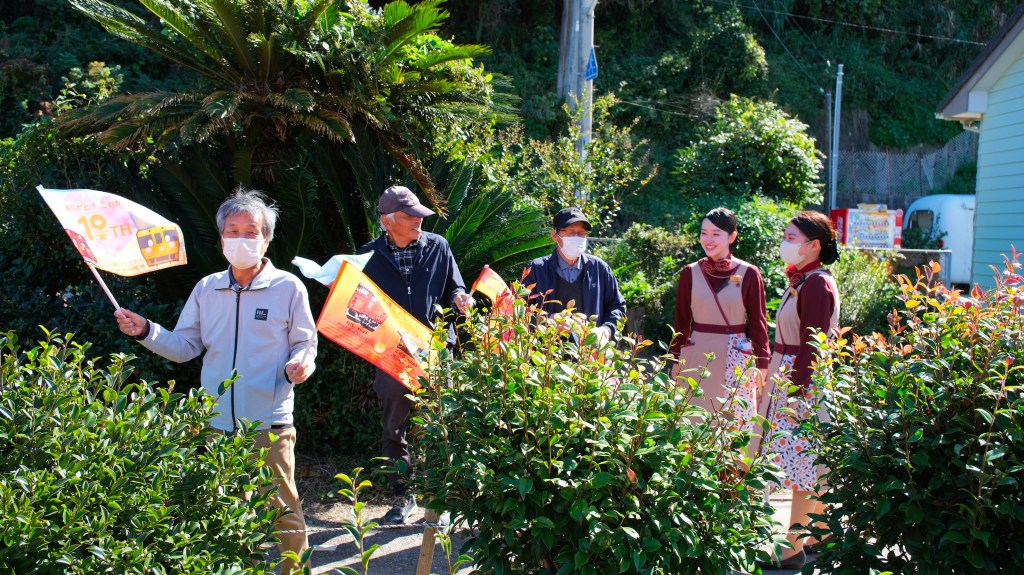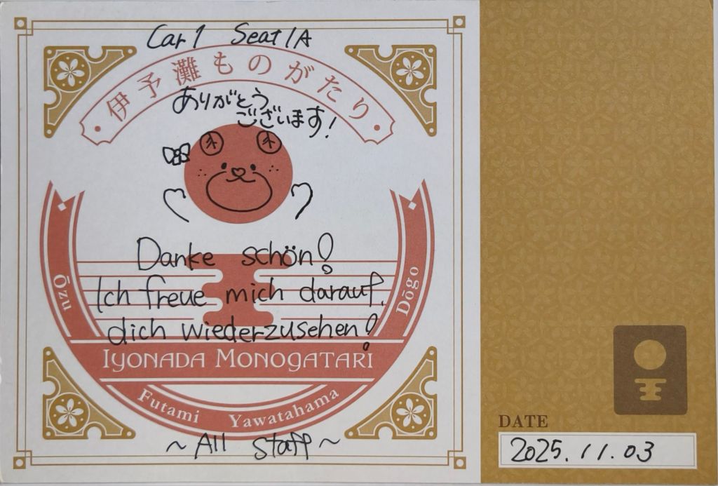Kurz vor der Ankunft in Ōzu werden wir von den freundlichen Zugbegleiterinnen einzeln verabschiedet, und ich erhalte ein besonderes Geschenk: eine handgeschriebene Dankeskarte mit einem liebevollen Gruß – auf Deutsch! Ich bin gerührt, vor allem weil diese Aufmerksamkeit nicht zum Standardprogramm gehört; ich sehe nicht, dass andere Passagiere solche Karten bekommen. Wahrscheinlich haben meine Augen während der Zugfahrt besonders vor Begeisterung geleuchtet.