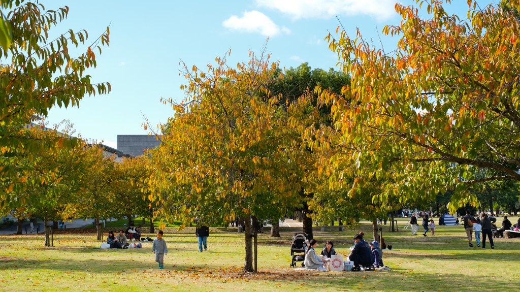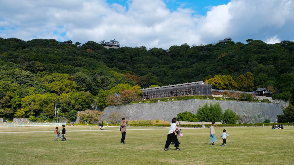 Für den Nachmittag habe ich mir vorgenommen, mein Tagebuch zu schreiben, aber ich entscheide mich, noch einen kleinen Spaziergang zu unternehmen, und komme (zufällig) zu einem ruhigen Park mit vielen Bäumen, an dessen Ende sich eine riesige, mit einzelnen Bäumen bepflanzte Rasenfläche auftut – etwa so groß wie vier Fußballfelder. Auf den Wiesen spielen Jugendliche und Familien ausgelassen, manche lassen Drachen steigen, Verliebte sitzen unter den gelb gefärbten, von der Sonne beschienenen Bäumen. Seniorinnen genießen die Herbstsonne. Über allem thront auf einem Berg die Burg – das Wahrzeichen der Stadt Matsuyama. Was für ein schöner Anblick. Was für ein schöner Tag.