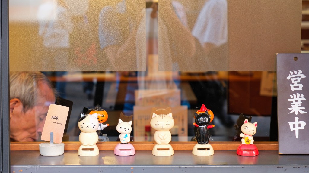 Für diesen Zug habe ich sogar die Rückfahrt gebucht – eigentlich nur wegen der sich verändernden Lichtverhältnisse zum Fotografieren. Aber der Rückweg lohnt sich, denn es gibt anderes (und nochmals besseres) Essen, und an einer Station wird uns eine Eisenbahnerkatze präsentiert – mit Mütze und ernstem Gesicht. Dabei weiß jeder Hobbyeisenbahner und jede Katzenfreundin, dass es nur eine amtlich zertifizierte Katze in dieser Funktion gab: Tama, dann Tama 2 und heute hoffentlich Tama 3. Sie amtierten / amten in Wakayama, südlich von Osaka.