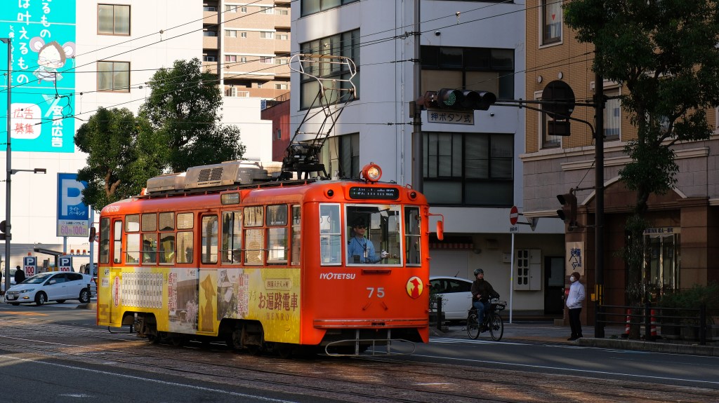Wie wenig Verkehr selbst an Wochentagen, auch in vergleichsweise großen Städten herrscht. In Osaka und Tokio ist das sicher anders, aber auf meiner Reiseroute staune ich über vergleichsweise leere Straßen. Ich sehe keine Staus, höre keine Hupkonzerte und auch Busse und Straßenbahnen sind nie überfüllt . Die Fußgängerinnen und Fußgänger hetzen nicht, niemand drängelt. Sehr gut gefallen mir die altmodischen Straßenbahnen, die in Matsuyama noch im Regelbetrieb sind.