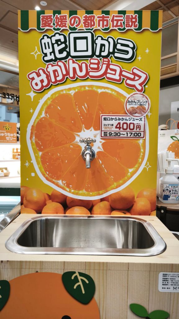 Ehime ist Japans Orangen- und Zitronenregion. In Matsuyama gibt es einen Platz, an dem man – gegen eine geringe Gebühr – frischen Orangensaft aus einem Wasserhahn zapfen kann. Der Geschmack variiert je nach Saison.