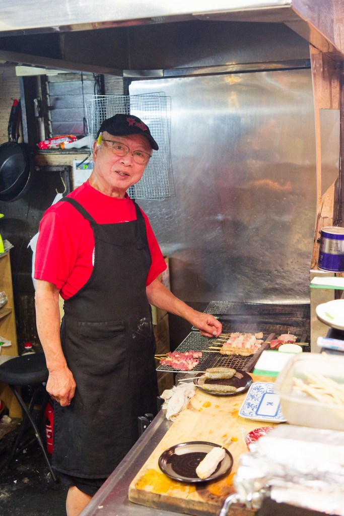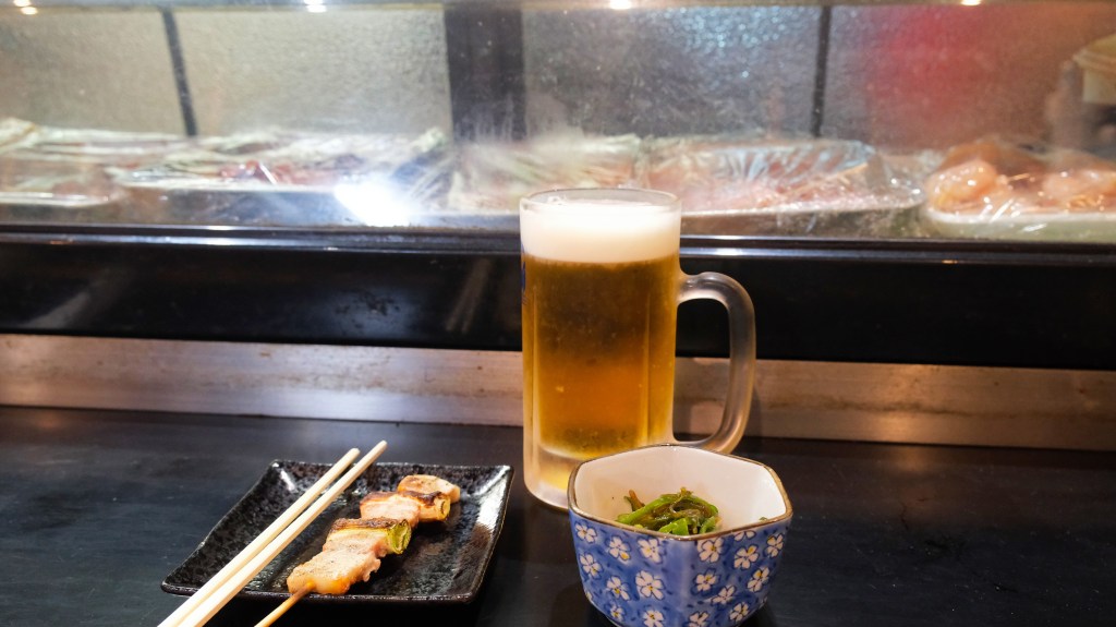 Da ich Bierdurst habe, mache ich mich auf die Suche nach einer zünftigen Izakaya. An drei Kneipen werde ich abgewiesen (fully booked) und denke, vielleicht wollen sie keine Touristen bedienen. Aber dann finde ich eine ganz unscheinbare Izakaya und werde mit offenen Armen empfangen. Es scheint ein Familienbetrieb zu sein – Mutter, Vater, Tochter –, und ich fühle mich sofort zu Hause. Das Bier wird frisch gezapft in eiskalte Gläser; ich bekomme einen Platz am Tresen und kann aus einer großen Auswahl Fleischspieße auswählen, die sofort am Gasgrill zubereitet werden. Alles lecker. Besonders das Bier.