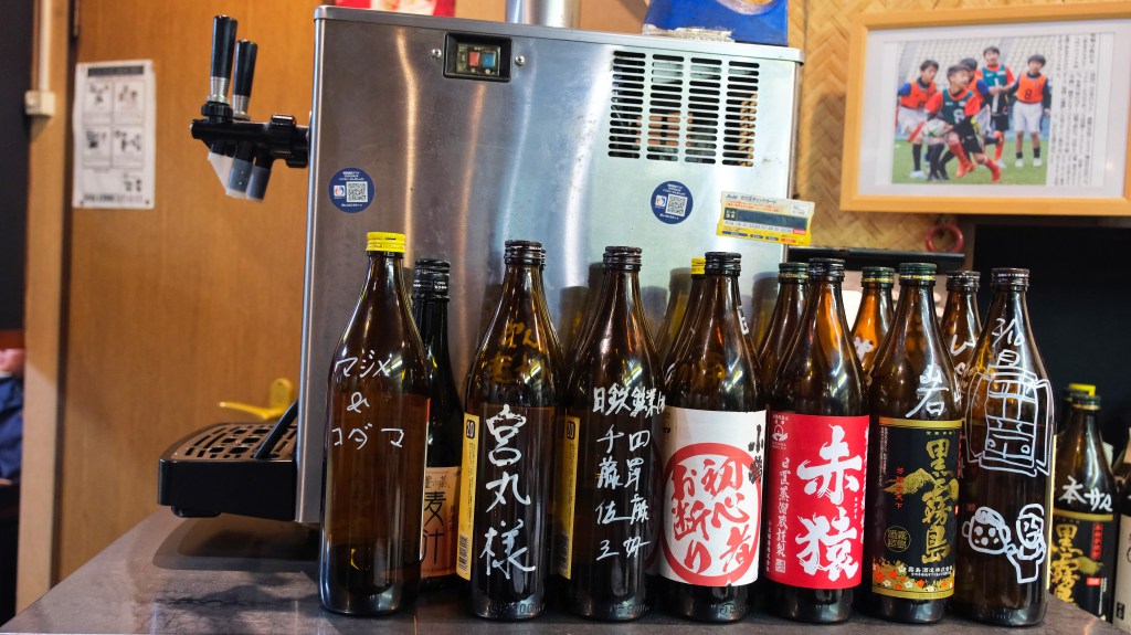 Dass in der Izakaya die personalisierten Sake- Flaschen der Stammkunden stehen. Diese sind mit Namen und manchmal lustigen Sprüchen und Zeichnungen versehen. Grund dafür ist, dass es billiger ist, eine Flasche zu bestellen, als einzelne Gläser. So können die Kunden ihre persönliche Flasche auf mehrere Restaurantbesuche aufteilen. Praktisch und kulant vom Wirt.