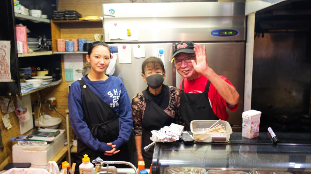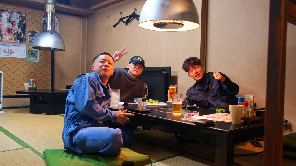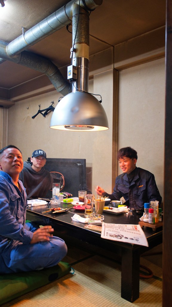 Etwas später kommen drei junge Kerle, die sich auf die Bodenmatten setzen (Schuhe aus!) und rauchen. Sie sind ziemlich ausgelassen; ich frage sie nach einem Foto, sie freuen sich. Rauchen ist erlaubt, wenn es spezielle Abzugsanlagen gibt. Die hängen hier genau über den Sitzplätzen und verleihen der Izakaya etwas Industriell-Verwegenes. Mir gefällt die Atmosphäre, ich bleibe lange – und verspreche, am kommenden Tag wiederzukommen.