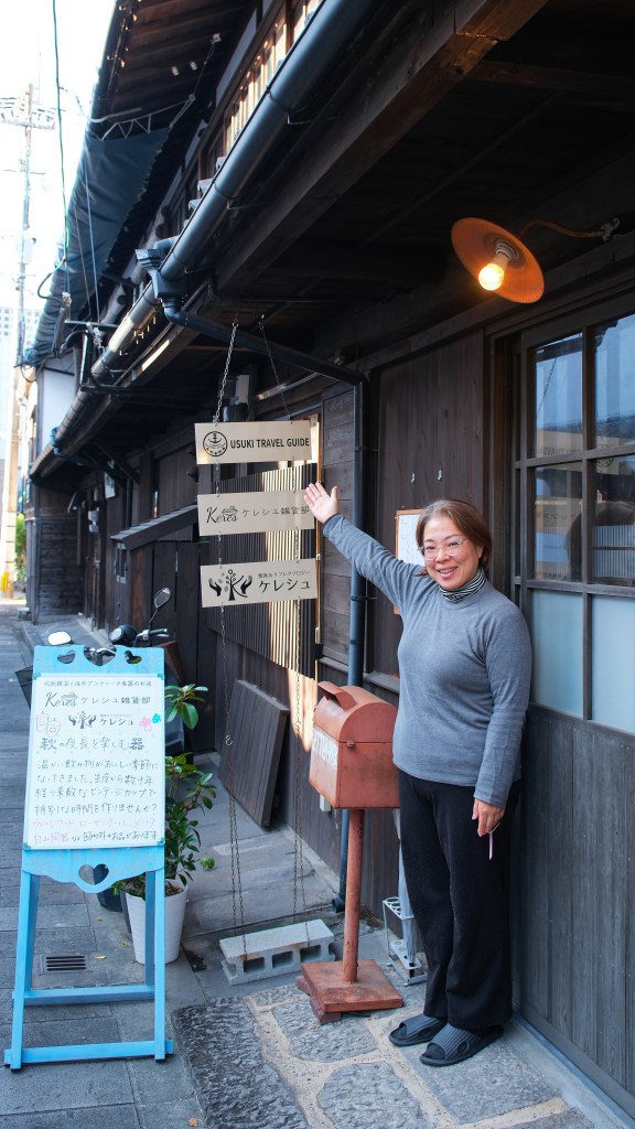 Meine neue Unterkunft finde ich schnell. Sie liegt im historischen Stadtteil, in dem viele Häuser etwa 200 Jahre alt sind – für japanische Verhältnisse sehr alt. Meine Gastgeberin Ai winkt mir schon zu und bittet mich in ihr Haus. Sie führt einen Laden, in dem sie Kunstgewerbe und importiertes Geschirr verkauft, zum Beispiel Porzellan aus Deutschland und Frankreich. Manches ist neu, anderes wirkt gebraucht. Außerdem bietet sie Taschen und Wollwaren von lokalen Produzenten an. Gastgeberin und Haus nehmen mich sofort für sich ein. Der ganze Ort – genau das, was ich gesucht habe: authentisches Japan ohne Trubel und Touristen.