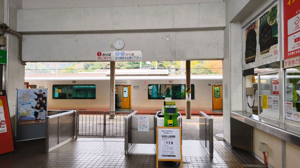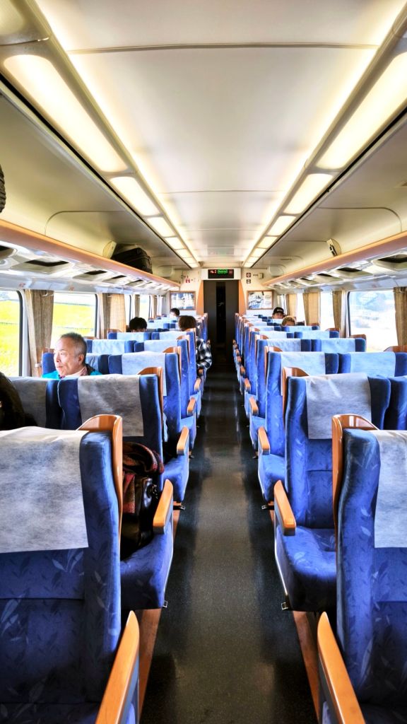 Dann kommt der Zug nach Usuki. Ein Limited Express wie gestern: riesige Fenster, viel Platz, wenige Fahrgäste und eine traumhafte grüne Landschaft. Regen, in Wolken gehüllte Berggipfel, Täler mit wabbernden Nebelschwaden. Bergauf, bergab.