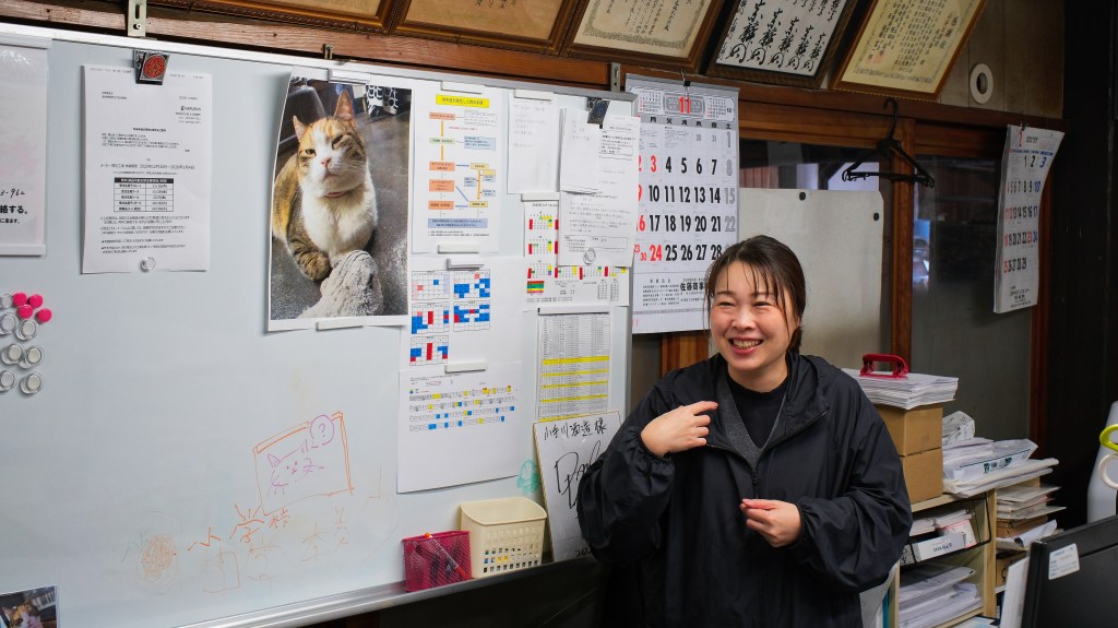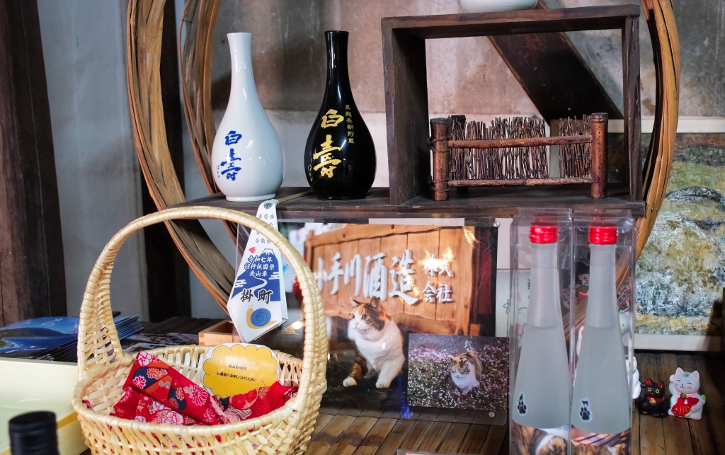 Dann gehe ich zur Sake-Brauerei, die mir Ai empfohlen hat. Der Direktor und eine freundliche Mitarbeiterin zeigen mir den Keller mit den unbezahlbaren alten Sake-Fässern, die Brauanlage, und sogar ihr Büro darf ich betreten. Dort hängen überall Fotos einer Katze. Ich erfahre, dass sie so etwas wie eine Mitarbeiterin der Firma war und über die Region hinaus bekannt und beliebt. Leider ist sie im vergangenen Jahr gestorben. Es gibt einen kleinen Schrein in Erinnerung an sie, und überall hängen Fotos von ihr. Zum Abschied bekomme ich zwei Karten mit ihrem Bild geschenkt.