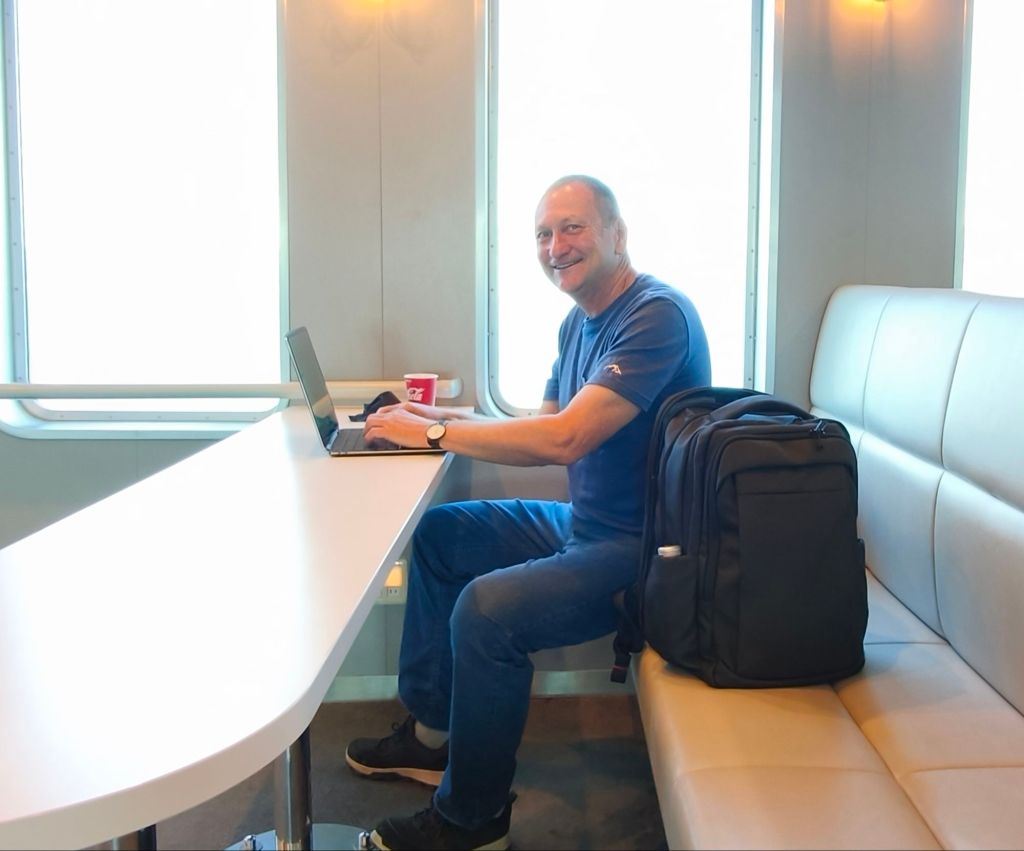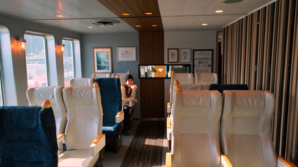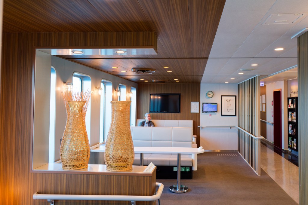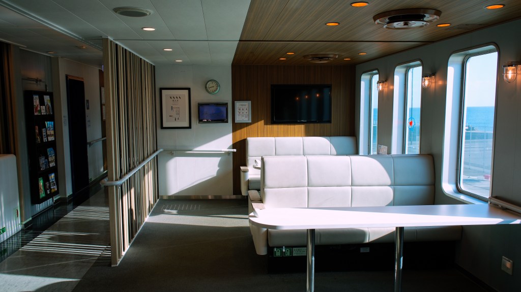 Als ich an Bord bin, denke ich, alles richtig gemacht, denn die erste Klasse macht wirklich etwas her, weiße Leidersitze, große saubere Tische, wenig Leute, Ruhe – alles perfekt. Die Stewardess geleitet mich jedoch über eine großen Treppe – mit Teppich und einem futuristischen leuchtenden Symbol darüber – auf das darüber liegende Deck. Da wird mir klar, dass ich gerade die Holzklasse gesehen habe und ich jetzt erst den Businessbereich betrete. Was dann kommt, macht mich sprachlos. In der ersten Klasse finden sich mehrere exklusive Bereiche. Ich werde zur Lounge geleitet – eine luxuriöse Kabine mit einzelnen Ledersesseln und einem phänomenalen Ausblick, durch ein Panoramafenster direkt in Fahrtrichtung, fast die Perspektive des Kapitäns einnehmend. Der sitzt nur ein Deck höher.